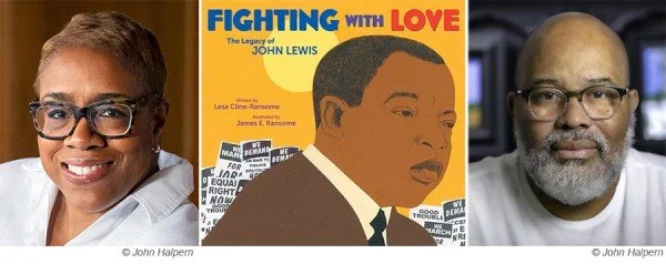 Lesa Cline-Ransome is the author of numerous nonfiction and historical fiction titles for young readers. Her verse biography of Harriet Tubman, Before She Was Harriet, illustrated by her husband and frequent collaborator James E. Ransome, was nominated for an NAACP Image Award and received a Coretta Scott King Honor for Illustration, among other accolades. Her debut middle grade novel, Finding Langston, won the Scott O’Dell Award for Historical Fiction and earned the Coretta Scott King Award Author Honor. In addition to illustrating several other award-winning books, James is also a recipient of the ALA Children’s Literature Legacy Award. We asked the couple to interview each other about their new picture book, Fighting with Love: The Legacy of John Lewis, their creative approaches, and their evolving connections to history.